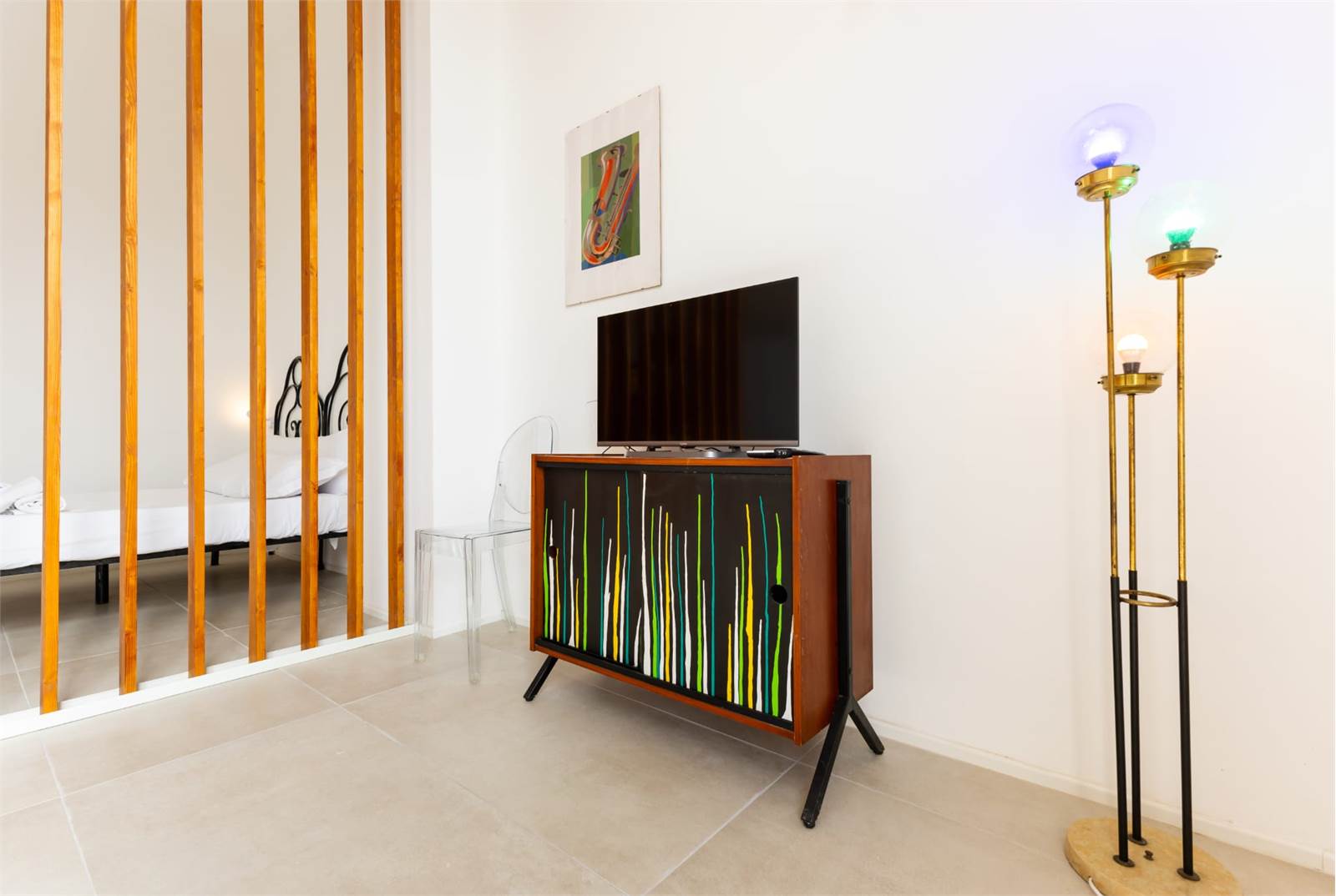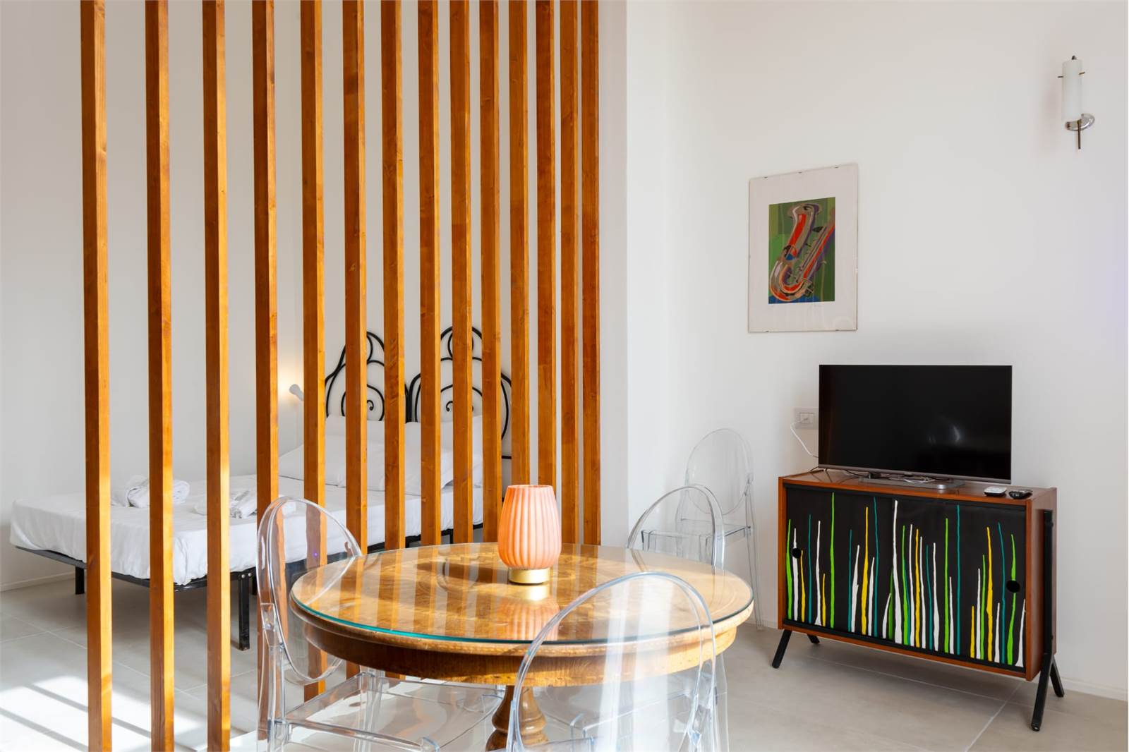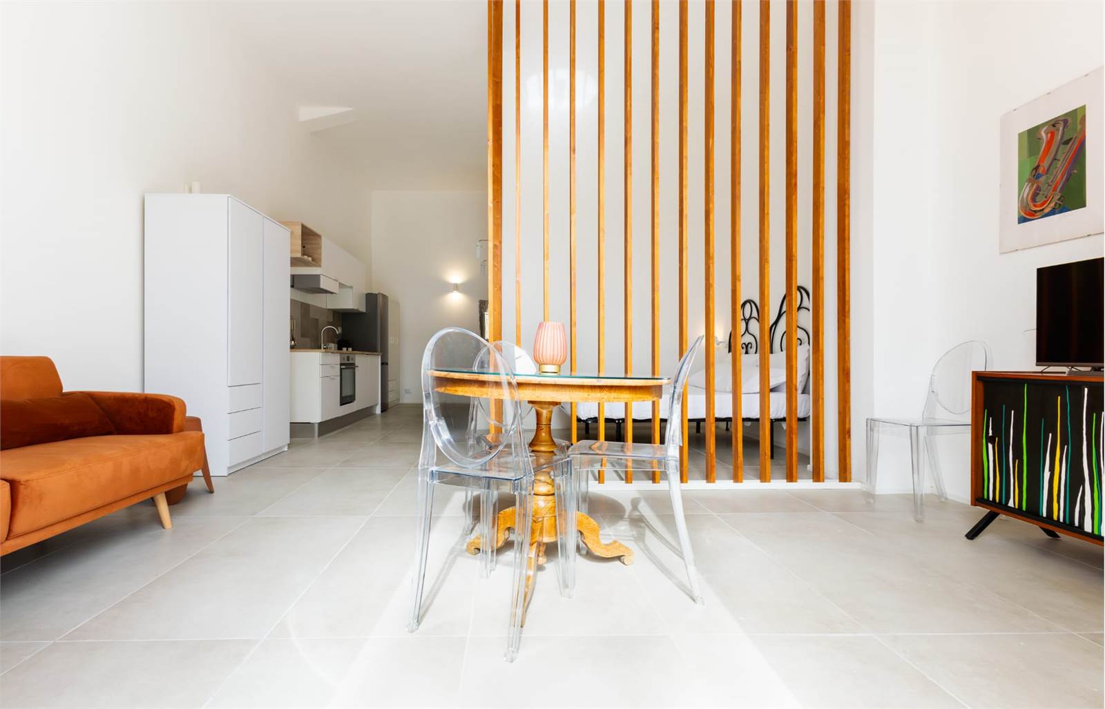 L’immobile, di circa 50 mq, si presenta funzionale e ben organizzato negli spazi: ingresso su cucina, accogliente soggiorno con divano letto e un elegante divisorio in legno che separa la zona notte con letto matrimoniale, garantendo comfort e privacy.