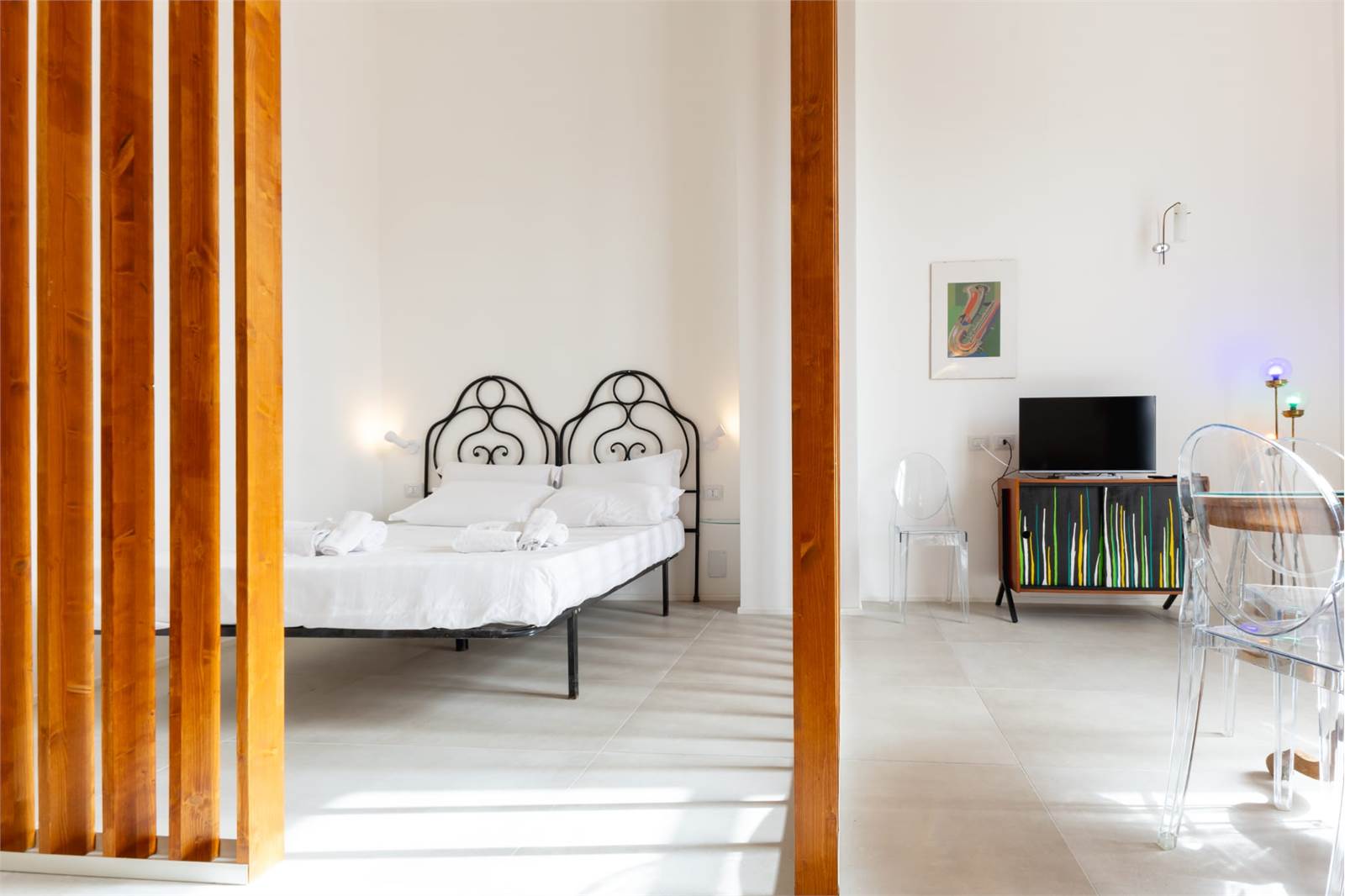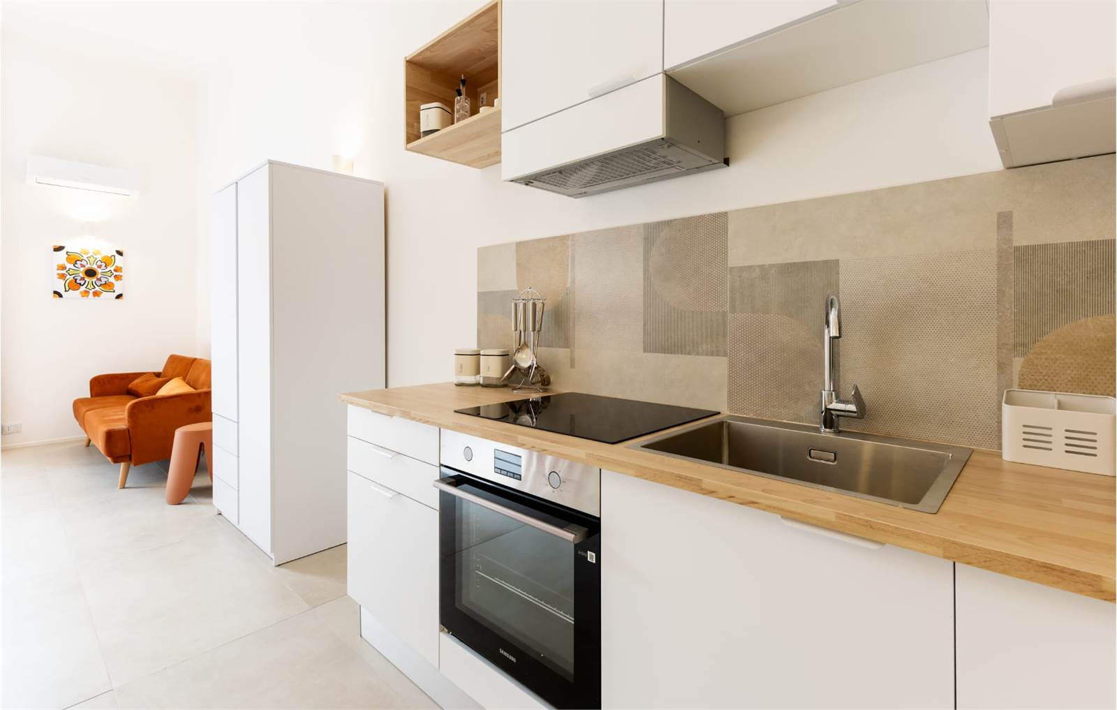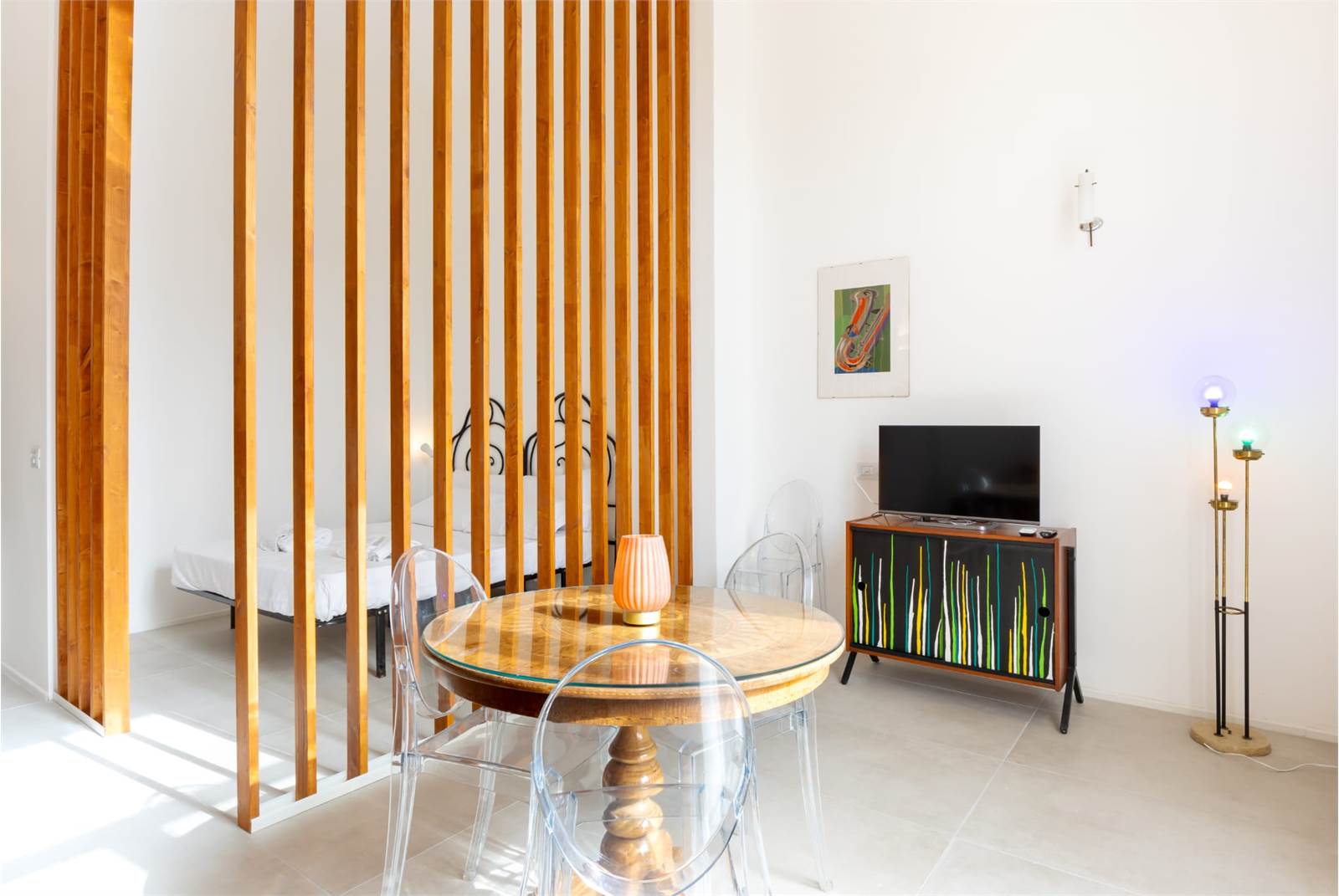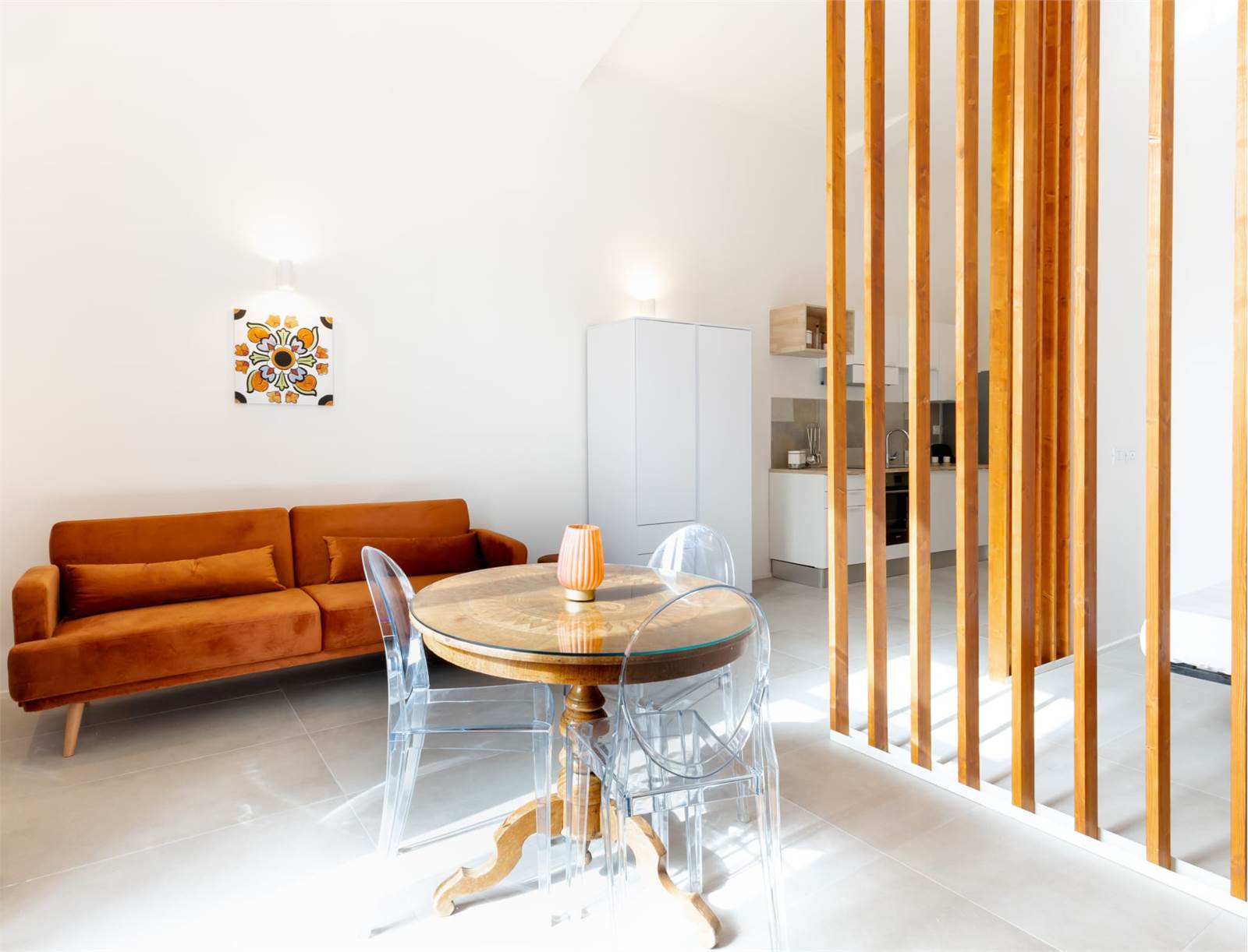 L’immobile, di circa 50 mq, si presenta funzionale e ben organizzato negli spazi: ingresso su cucina, accogliente soggiorno con divano letto e un elegante divisorio in legno che separa la zona notte con letto matrimoniale, garantendo comfort e privacy.