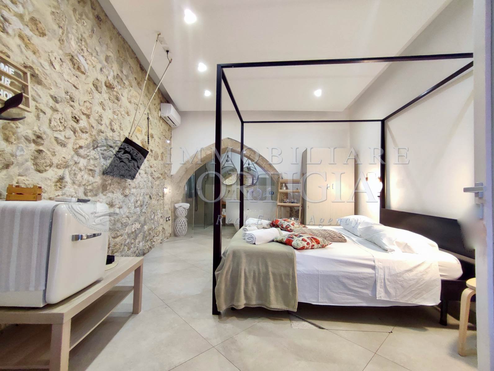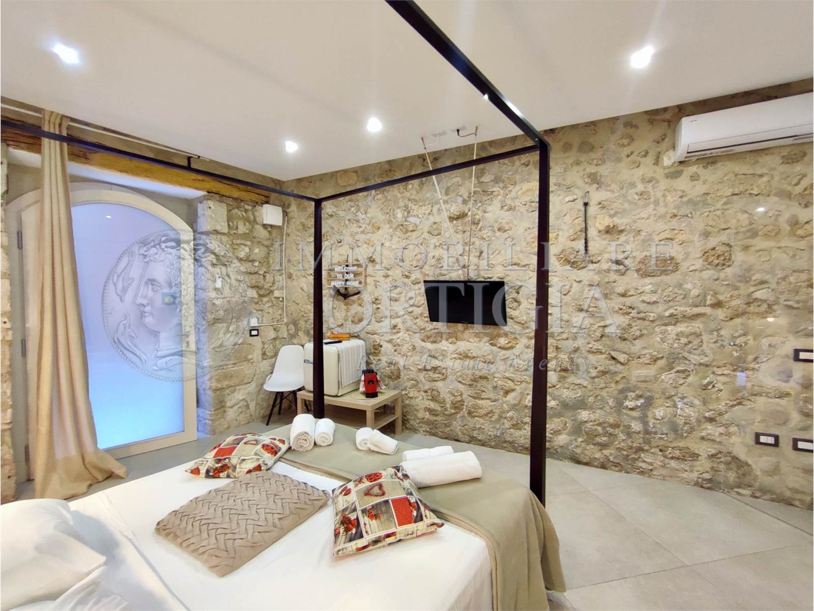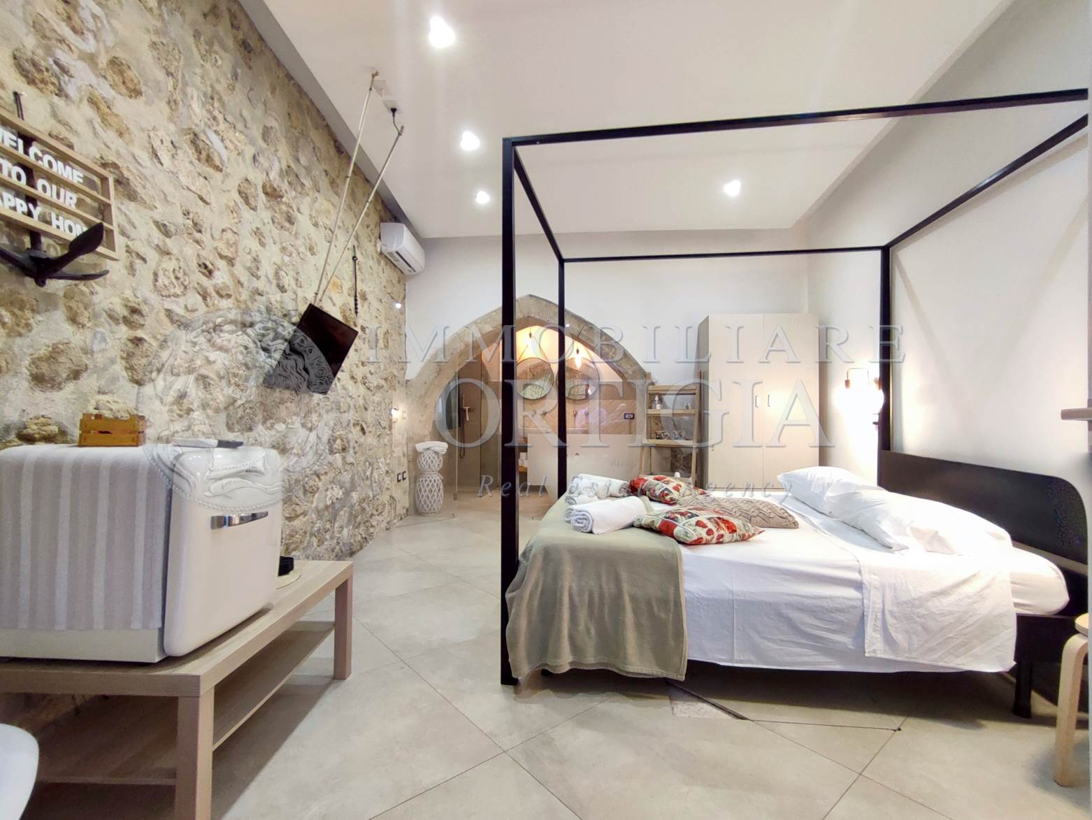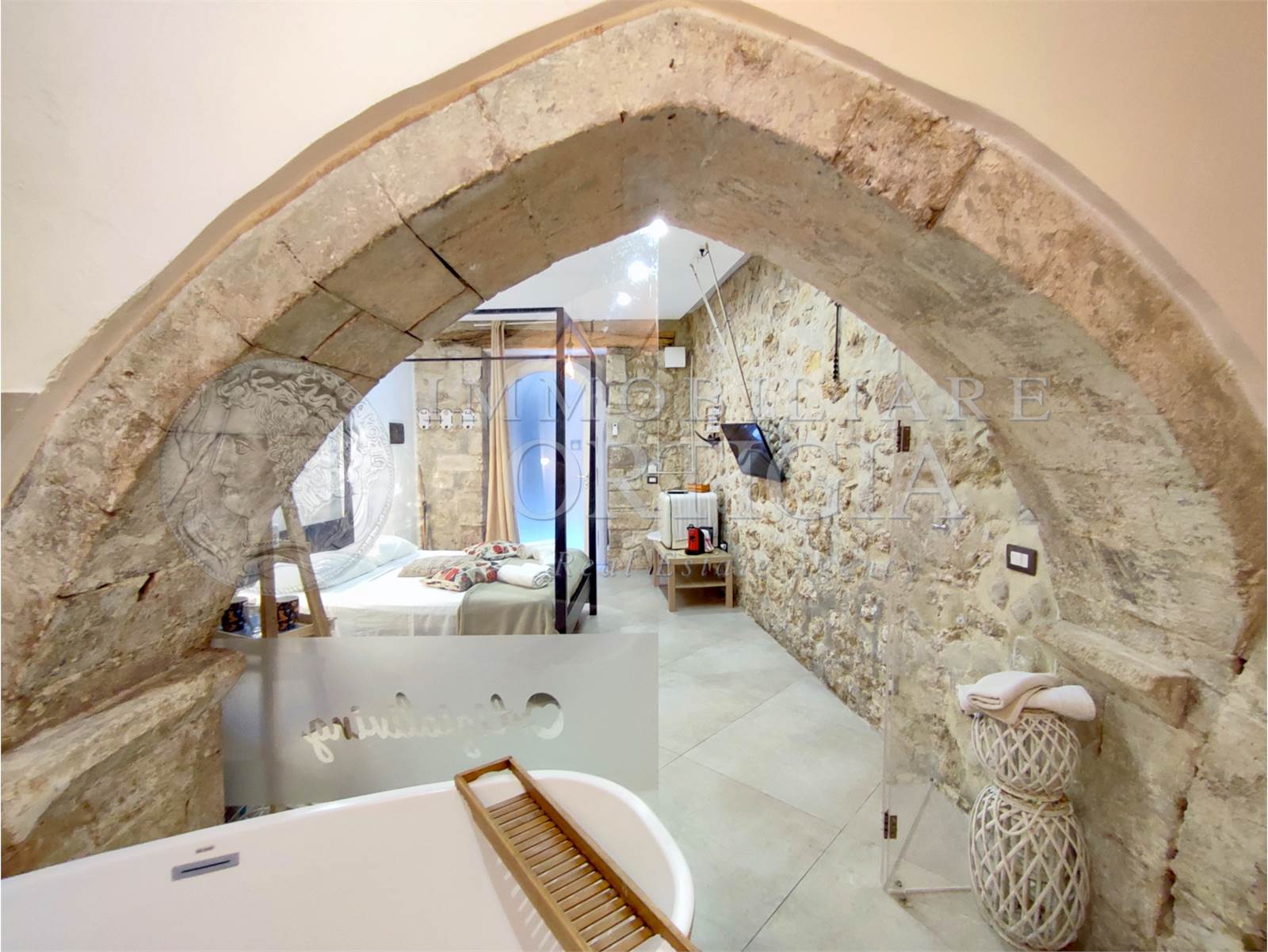 Vivi l’autentico fascino di Ortigia in questo incantevole appartamento al piano terra nel cuore della Giudecca, 41 mq di pura magia con pietra a vista e un suggestivo arco che racconta storie antiche, con bagno a vista,