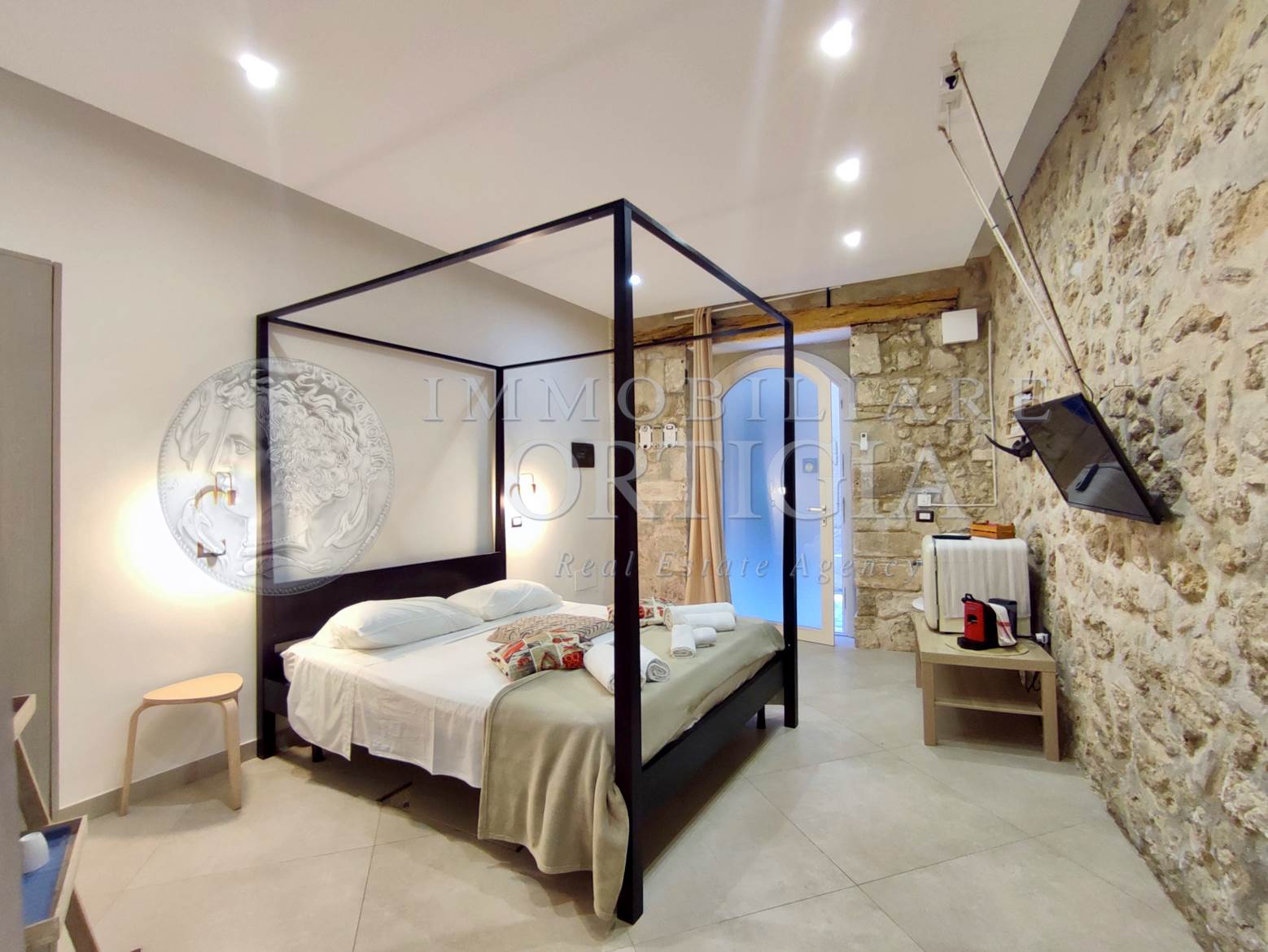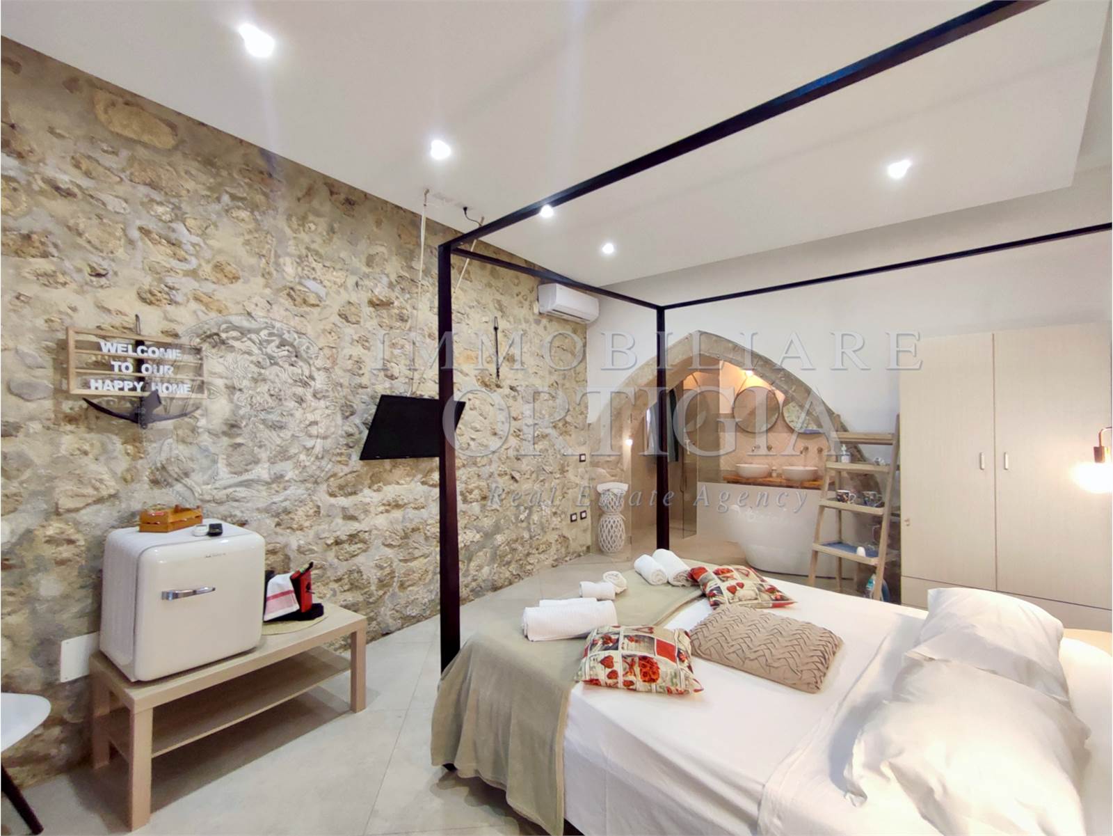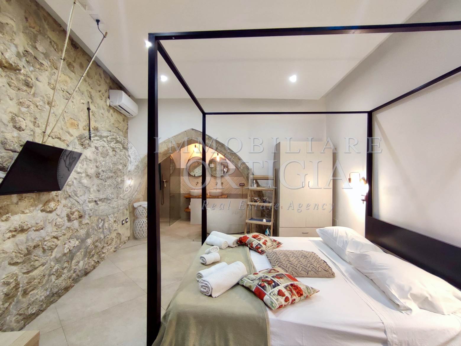 Vivi l’autentico fascino di Ortigia in questo incantevole appartamento al piano terra nel cuore della Giudecca, 41 mq di pura magia con pietra a vista e un suggestivo arco che racconta storie antiche, con bagno a vista,