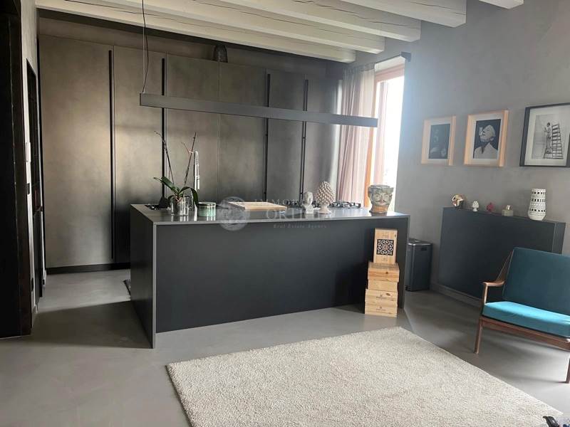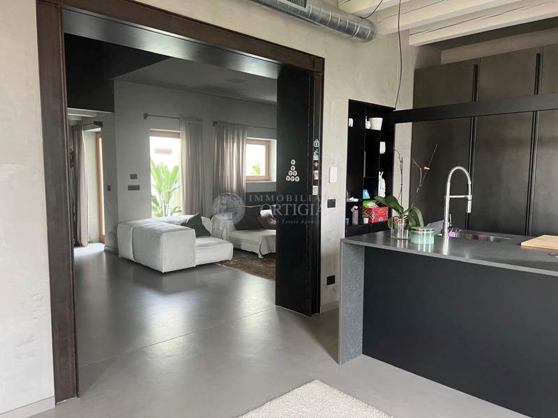 La zona giorno prosegue con una spaziosa cucina realizzata su misura e completamente attrezzata, affiancata da una sala da pranzo armoniosamente integrata negli spazi, curati nei minimi dettagli anche nelle scelte cromatiche. Le finestre, affacciate su entrambi i lati dell’edificio, garantiscono ambienti silenziosi e riservati.